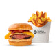 Panino con hamburger di Fassona Piemontese, maionese, scamorza, insalata, ketchup. Accompagnato da patatine